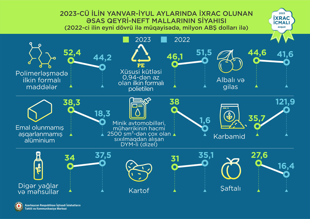 2023-cü ilin yanvar-iyul ayları ərzində ixrac edilən qeyri-neft sektoruna aid malların siyahısında elektrik enerjisi (314,5 milyon ABŞ dolları) birinci olub. Bu siyahıda pomidor (tomat) (124,2 milyon ABŞ dolları) ikinci, pambıq mahlıcı (79,4 milyon ABŞ dolları) isə üçüncü yerdə qərarlaşıb.