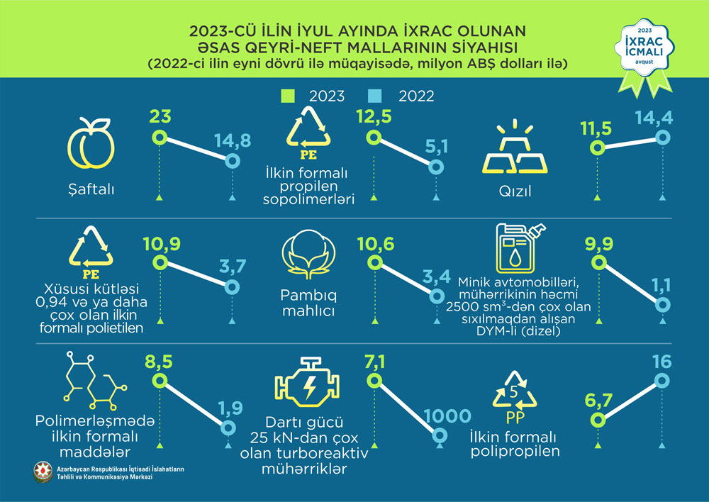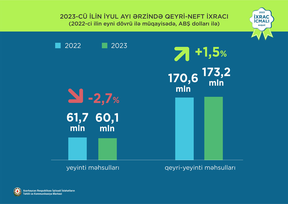 2023-cü ilin iyul ayının qeyri-neft ixracı ötən ilin müvafiq dövrü ilə müqayisədə 0,4% artaraq 233,2 milyon ABŞ dolları təşkil edib. 2023-cü ilin iyul ayı ərzində yeyinti məhsulları üzrə ixrac 60,1 milyon ABŞ dolları, qeyri-yeyinti məhsulları üzrə isə 1,5% artaraq 173,2 milyon ABŞ dollarına bərabər olub.