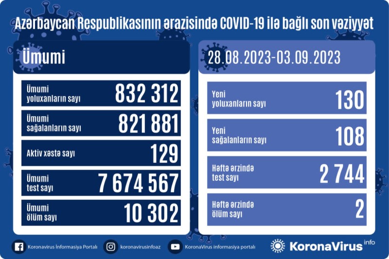 Azərbaycanda koronavirus (COVID-19) infeksiyasına son 1 həftədə (28.08.2023-03.09.2023) 130 yeni yoluxma faktı qeydə alınıb, 108 nəfər müalicə olunaraq sağalıb.