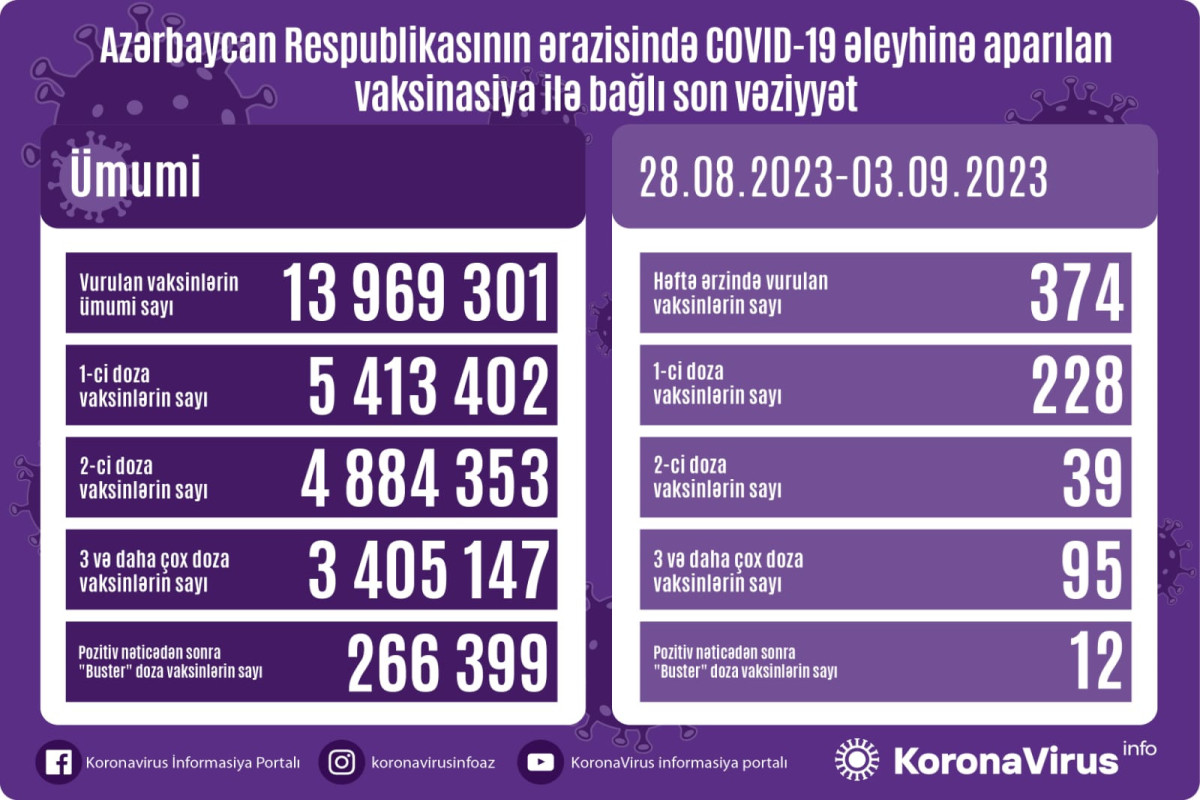 Azərbaycanda avqustun 28-dən sentyabrın 3-dək koronavirus (COVID-19) əleyhinə 374 vaksin vurulub.