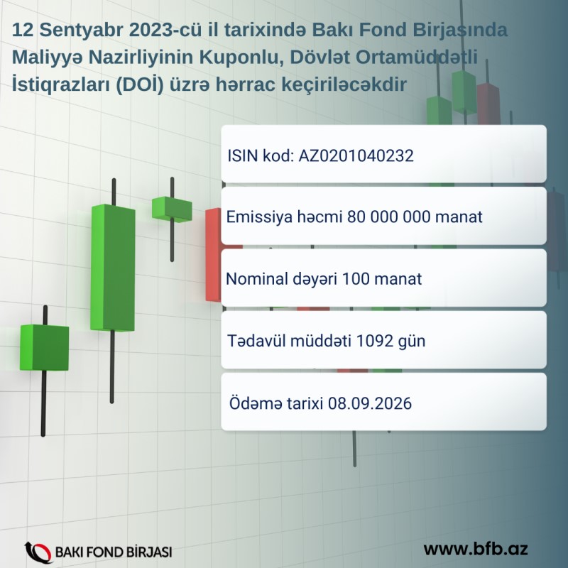 12 sentyabr 2023-cü il tarixində Bakı Fond Birjasında Maliyyə Nazirliyinin 80 milyon manatlıq Kuponlu, Dövlət Ortamüddətli İstiqrazları (DOİ) üzrə hərrac keçiriləcəkdir.