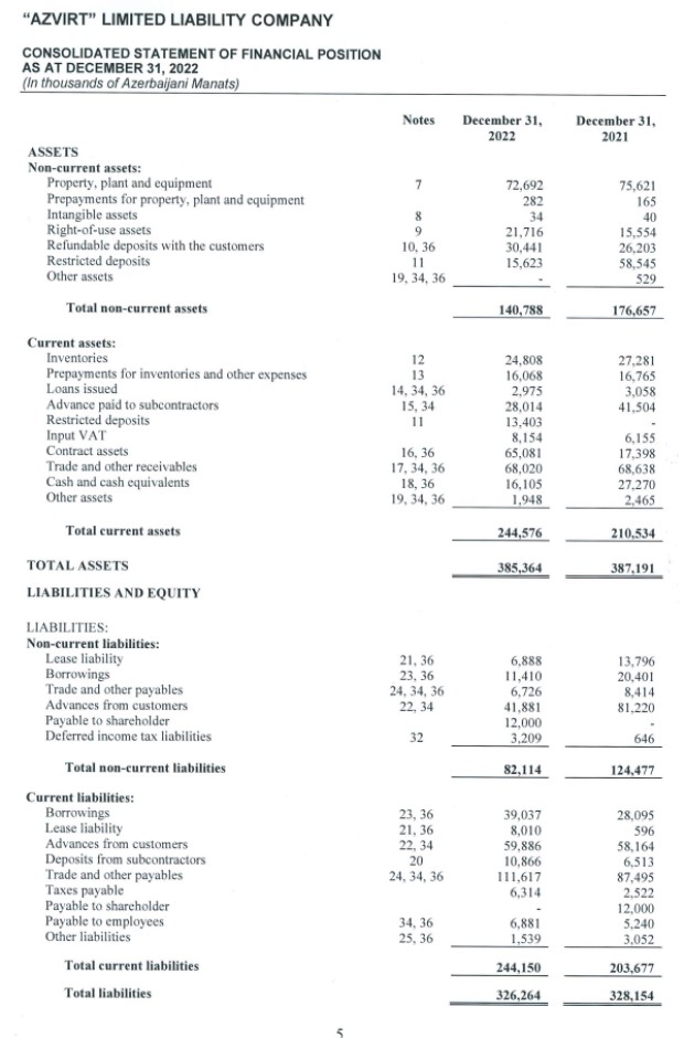 31 dekabr 2022-ci il tarixində "AzVirt" MMC 385 milyon 364 min manat cəmi kativlərə malik olub. Şirkət 2021-ci ilin sonunda 387 milyon 191 min manat cəmi aktivlərə malik idi.
