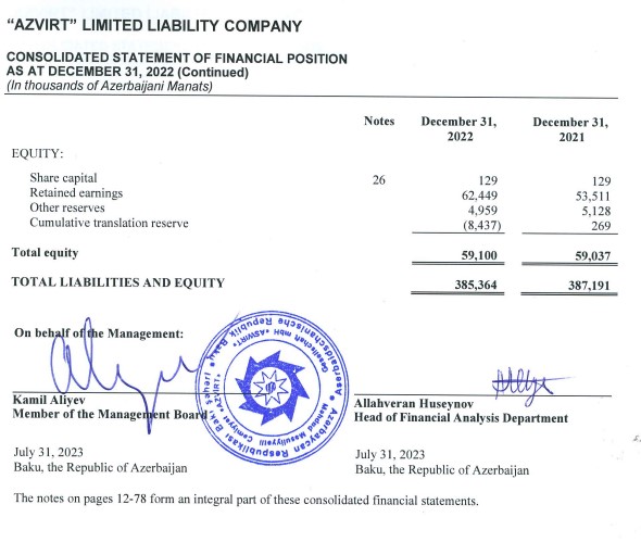 "AzVirt" MMC 2022-ci ili 8 milyon 938 min manat xalis mənfəət ilə başa vurub. Şirkət 2021-ci ili 6 milyon 527 min manat xalis mənfəət ilə bağlamışdı. Beləliklə, 2021-ci illə müqayisədə 2022-ci ildə "AzVirt" MMC-nin xalis mənfəəti 2 milyon 411 min manat və ya 37% artıb.