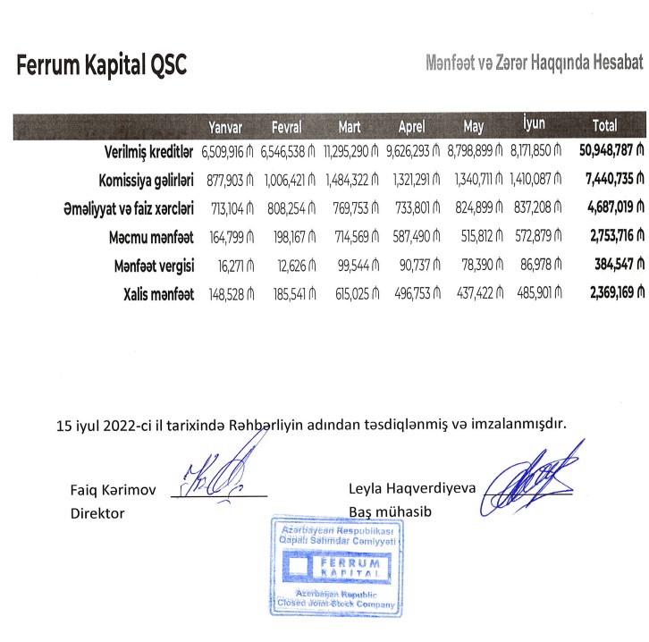 Faktorinq məhsulları ilə alıcılara hissə-hissə ödəniş imkanı yaradan "Ferrum Kapital"ın dövriyyəsi azalıb."AQA Şirkətlər Qrupu" QSC-yə daxil olan və faktorinq xidmətləri göstərən "Ferrum Kapital" QSC 2023-cü ilin ilk 6 ayını (yanvar-iyun) 2 milyon 17 min manat xalis mənfəət ilə başa vurub. Şirkət ötən ilin eyni dövrünü 2 milyon 369 min manat xalis mənfəət ilə bağalmışdı. Beləliklə, Şirkətin yarımillik xalis mənfəəti 352 min manat azalıb.