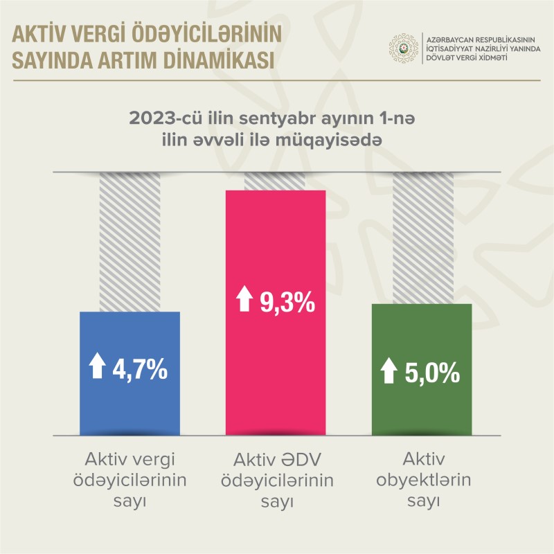 Sentyabr ayının 1-nə ölkədə aktiv vergi ödəyicilərinin sayı ilin əvvəli ilə müqayisədə 4,7 faiz artaraq 745,6 min olub.