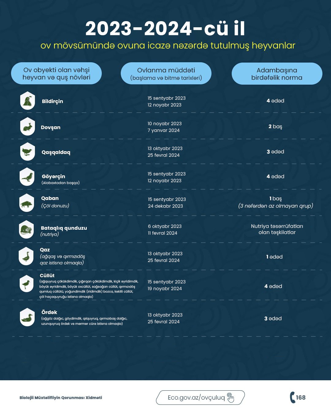 Respublika ərazisində 2023-2024-cü illərin ov mövsümündə “Ovlanmasına icazə verilən vəhşi heyvanların və quşların ovlanma müddətləri və normaları" ilə aşağıdakı posterdən tanış ola bilərlər.
