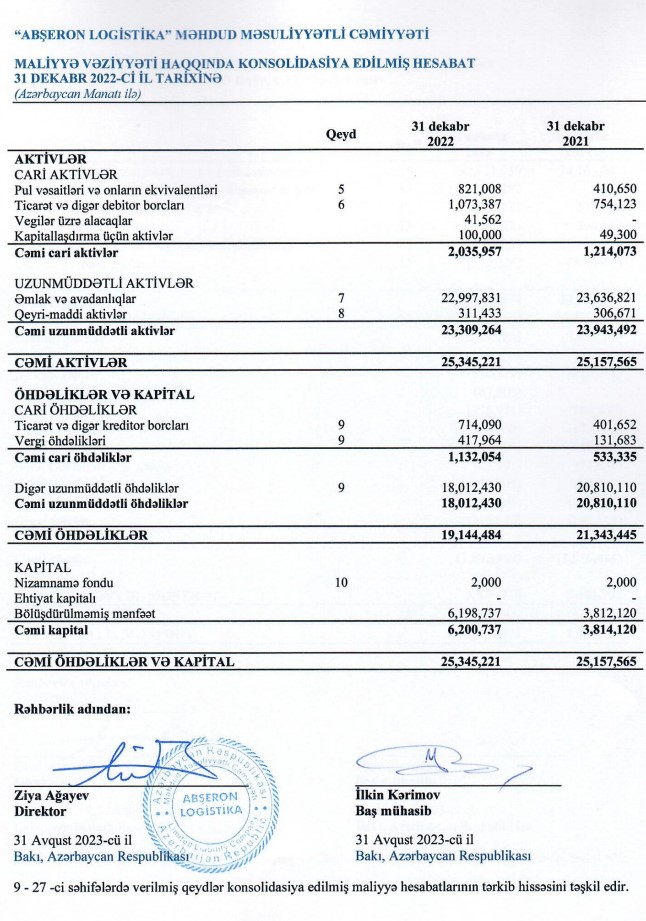 31 dekabr 2022-ci il tarixində "Abşeron Logistika" MMC 25 milyon 345 min manat cəmi aktivlərə malik olub. Şirkət 2021-ci ilin sonunda 25 milyon 158 min manat cəmi aktivlərə malik idi.