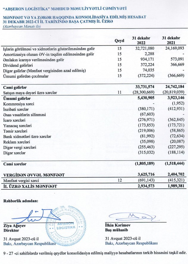 "Abşeron Logistika" MMC 2022-ci ili 2 milyon 935 min manat xalis mənfəət ilə başa vurub. Şirkət 2021-ci ili 1 milyon 989 min manat xalis mənfəət ilə bağlamışdı. Beləliklə, ötən il "Abşeron Logistika" MMC-nin xalis mənfəəti 945 min manat və ya 47,5% artıb. Xalis mənfəətin artması gəlirlərin artmasından qaynaqlanır.