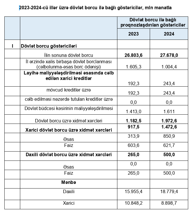 2024-cü ilin dövlət büdcəsinin gəlirləri 33 milyard 765 milyon manat, xərcləri 36 milyard 355 milyon manat, kəsiri 2 milyard 590 milyon manat nəzərdə tutulur. 2024-cü ildə xam neftin bir barrelinin orta illik ixrac qiyməti 60 ABŞ dolları səviyyəsində götürülür.2024-cü ilin dövlət və icmal büdcələrinin ilkin göstəriciləri açıqlanıb.