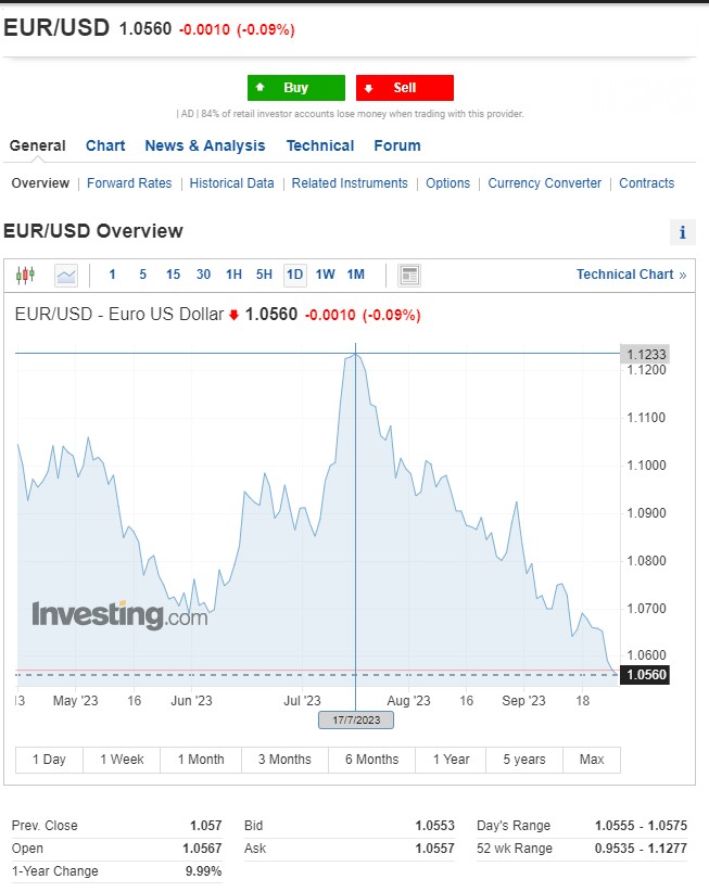 2023-cü ilin İyul ayının ortalarında Avro/ABŞ dolları məzənnəsi 1,12 dolları keçmişdi. Hazırda Avro/Dollar məzənnəsi 1,05 səviyyələrindədir. Ötən müddətdə Avro dollar qarşısında da 6%-dən çox dəyər itirib.