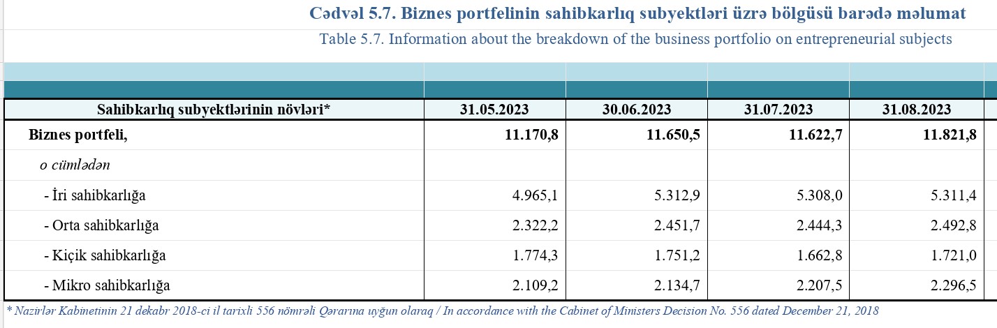 Avqustda cəmi biznes kreditlərindəki 199,1 milyon manatlıq artımın 74%-i və ya 147,2 milyon manatı mikro və orta sahibkarlığa verilən kreditlərin hesabına olub.