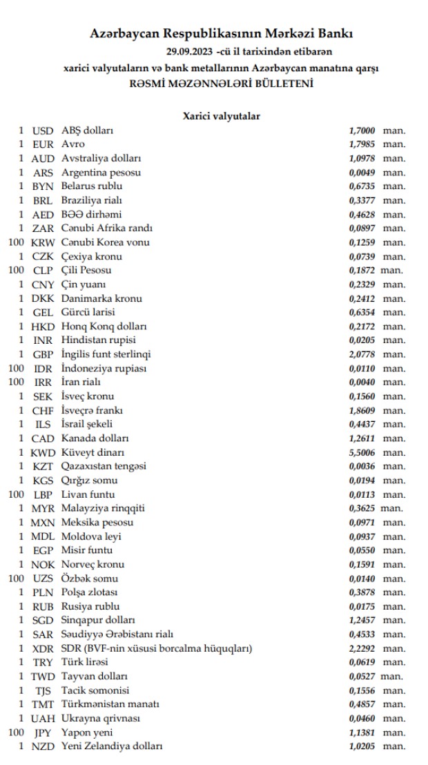 Rəsmi məzənnələr açıqlandı