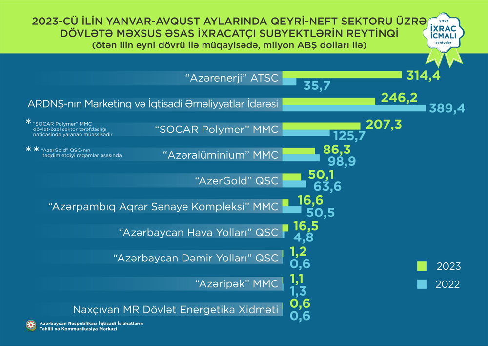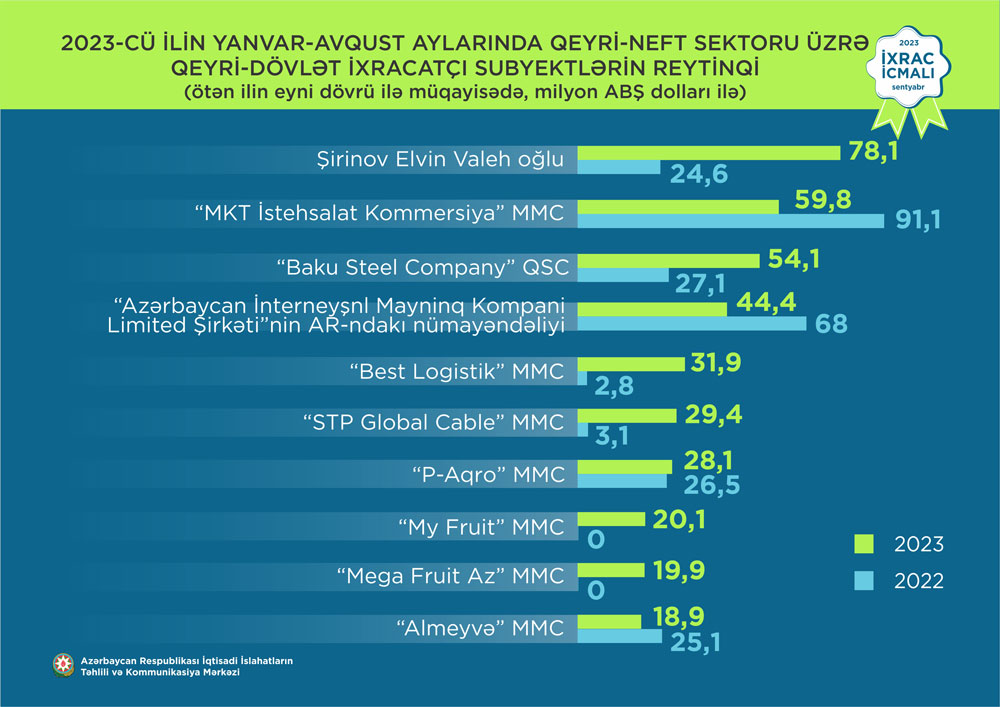 Marja.az xəbər verir ki, İqtisadi İslahatların Təhlili və Kommunikasiya Mərkəzinin (İİTKM) hazırladığı “İxrac icmalı”nın sentyabr sayında “İxrac icmalı”nda qeyri-neft sektoru üzrə 2023-cü ilin yanvar-avqust aylarında həyata keçirilmiş ixracla bağlı həm qeyri-dövlət, həm də dövlətə məxsus ixracatçı subyektlərin reytinqi yer alıb.
