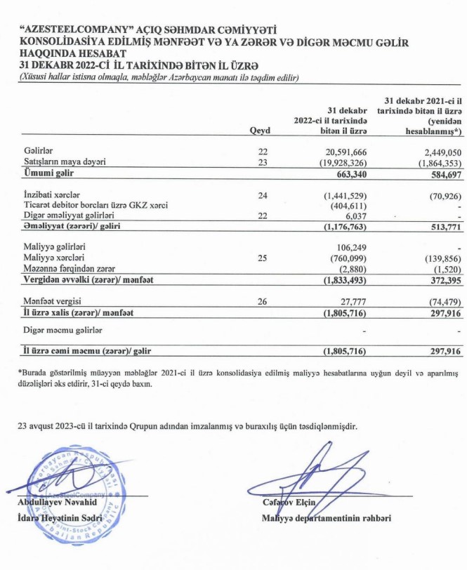 Marja.az Şirkətin yarımillik hesabatına istinadən xəbər verir ki, "Azesteelcompany" şirkətinin 2021-ci ildə gəlirləri 2 milyon 449 min manat ikən, 2022-ci ildə 20 milyon 592 min manata yüksəlib (8,4 dəfə artıb).