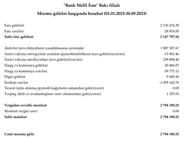 Marja.az-ın məlumatına görə, 2023-cü ilin 9 ayında "Bank Melli İran" Bakı filialın faiz gəlirləri 2 miylon 177 min manat, haqq və komissiya gəlirləri 50 min 406 manat təşkil edib. Eyni zamanda, ehtimal olunan aktiv itkiləri üçün üzrə yaradılmış ehtiyatlardan 1 milyon 987 min manat azad olub.