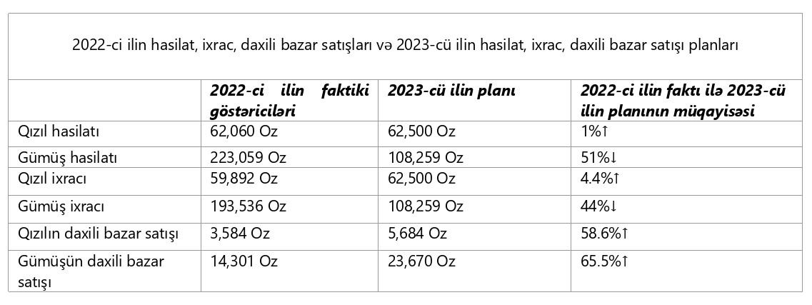 2023-cü ilin yanvar-sentyabr aylarında isə QSC tərəfindən 38.3 min unsiya qızılın hasilatı, 36.4 min unsiya qızılın ixracı həyata keçirilib. Bununla cari ilin ilk 9 ayı üçün müəyyənləşdirilmiş qızıl hasilatı planı 6%, qızıl ixracı planı isə 30% artıq icra edilib. Ümumilikdə, cari il üzrə 62.5 min unsiya qızıl hasilatı və ixracı planlaşdırılıb ki, bu da ötən ilin göstəriciləri ilə müqayisədə hasilatda 1%, ixracda isə 4.4% daha artıq hədəfdir.