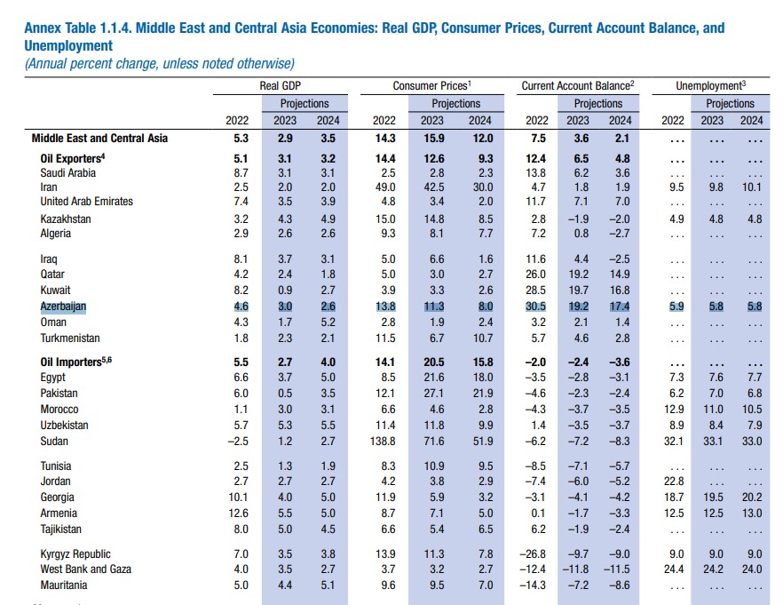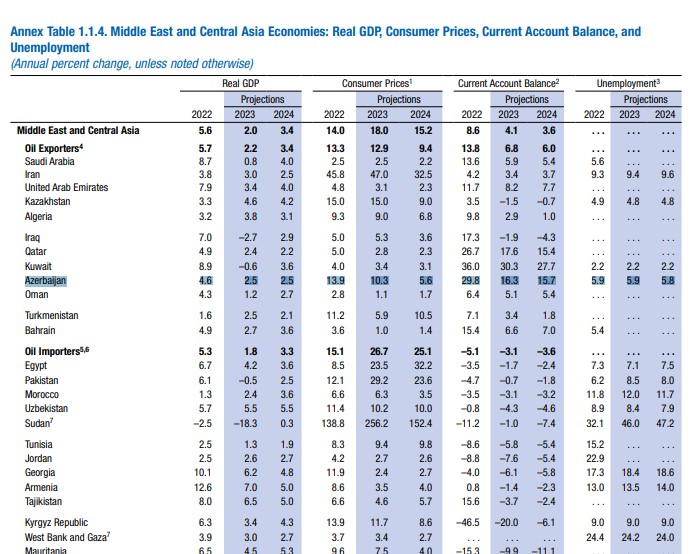 BVF-nin “Dünya iqtisadiyyatının inkişaf perspektivləri” hesabatının oktyabr sayına görə, Azərbaycanda 2023-cü ildə 10.3%, 2024-cü ildə 5.6% inflyasiya proqnozlaşdırılır. Hesabatın Aprel sayında proqnozlar müvafiq olaraq 11.3% və 8% idi.