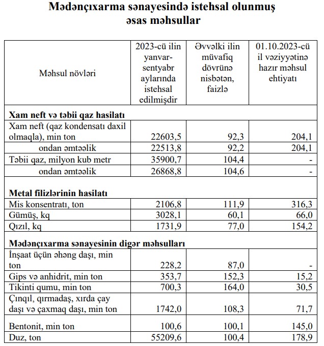 Azərbaycanın mədənçıxarma sənayesində istehsalın ümumi dəyəri 34,4 milyard manat olmaqla, əvvəlki ilin müvafiq dövrünə nisbətən 2,4 faiz azalıb.