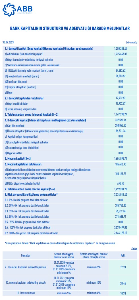 30 sentyabr 2023-cü il tarixində “ABB" ASC 1 milyard 499 milyon 282 min manat məcmu kapitala malik olub. Bankda 1-ci dərəcəli kapitalın adekvatlıq əmsalı 17,28% (minimum 6%), məcmu kapitalın adekvatlıq əmsalı 20,44% (minimum 12%) və leverec əmsalı 10,70% (minimum 5%) olub.