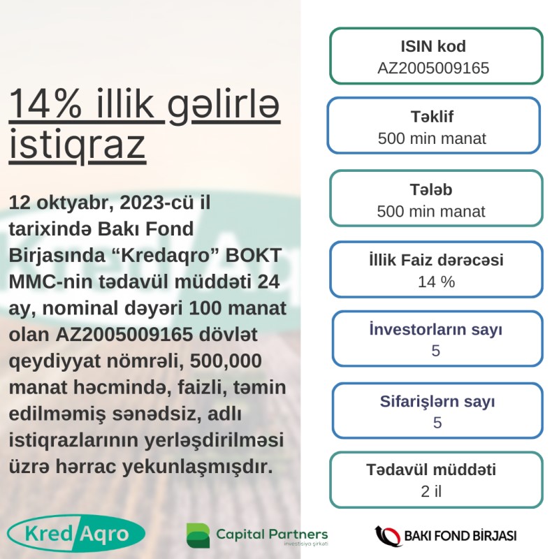 Həmçinin 12 oktyabr, 2023-cü il tarixində Bakı Fond Birjasında “Kredaqro” BOKT MMC-nin tədavül müddəti 24 ay, nominal dəyəri 100 manat olan AZ2004009166 dövlət qeydiyyat nömrəli, 500 min manat həcmində, faizli, təmin edilməmiş sənədsiz, adlı istiqrazlarının yerləşdirilməsi üzrə hərrac yekunlaşıb.