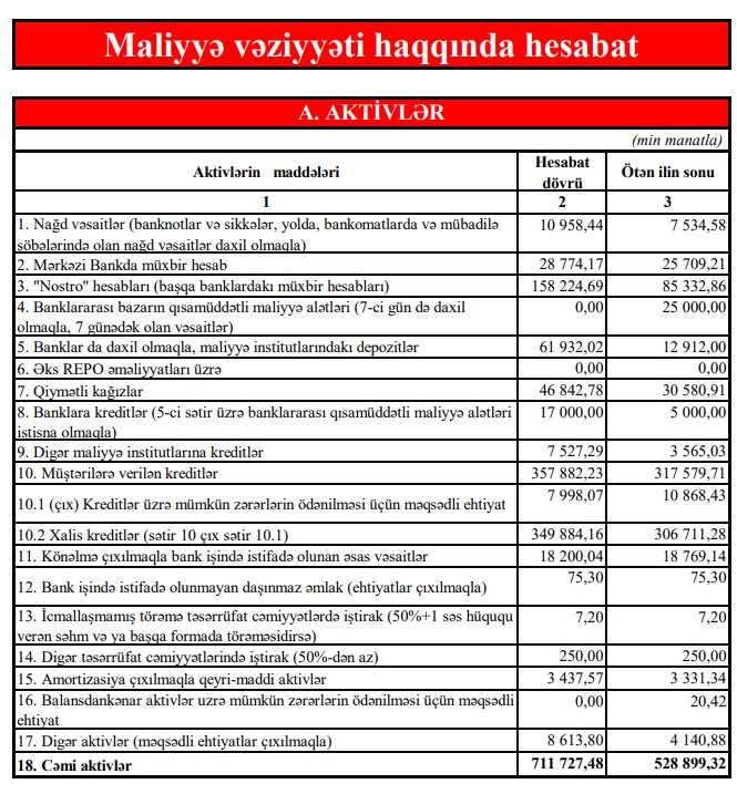 Bankın yaydığı məlumatda bildirilir ki, hesabata əsasən bank ilin əvvəlindən başlayan müsbət artım dinamikasını davam etdirib. Belə ki, ötən ilin müvafiq dövrü ilə müqayisədə bankın aktivləri 63% artaraq 712 milyon manata çatmışdır.