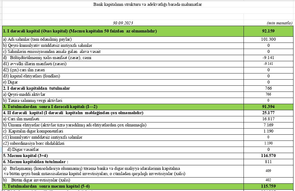 "Açıqlanan hesabatdan görünür ki, bank dayanıqlı inkişaf üçün kifayət qədər yüksək kapital ehtiyatına malikdir və bankın kapitalı 7% artaraq 119,5 milyon manata çatıb",- məlumatda bildirilir.