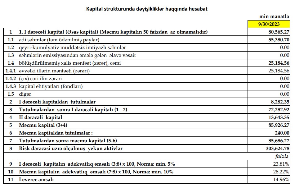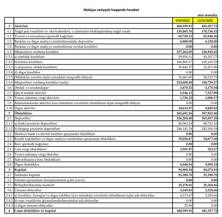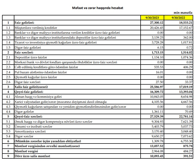 "Yapı Kredi Bank Azərbaycan" QSC 2023-cü ilin 9 ayını (yanvar-sentyabr) 10 milyon 93 min manat xalis mənfəət ilə başa vurub. Bank 2022-ci ilin 9 ayını 391 min manat xalis mənfəət ilə bağlamışdı. Beləliklə, "Yapı Kredi Bank Azərbaycan"nın xalis mənfəəti 2023-cü ilin 9 ayında ötən ilin eyni dövrü ilə müqayisədə 9 milyon 702 manat və ya 25,8 dəfə artıb. Xalis mənfəətin artması gəlirlərin artmasından və mümükün zərərlər üçün yaradılan məqsədli ehtiyatlara ayırmanın azalmasından qaynaqlanır.