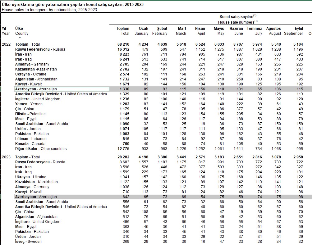 2023-cü ilin 9 ayı ərzində (yanvar-sentyabr) Azərbaycan vətəndaşları Türkiyədə 642 ev alıblar. Bu say ötən ilin 9 ayında 1330 ev idi.