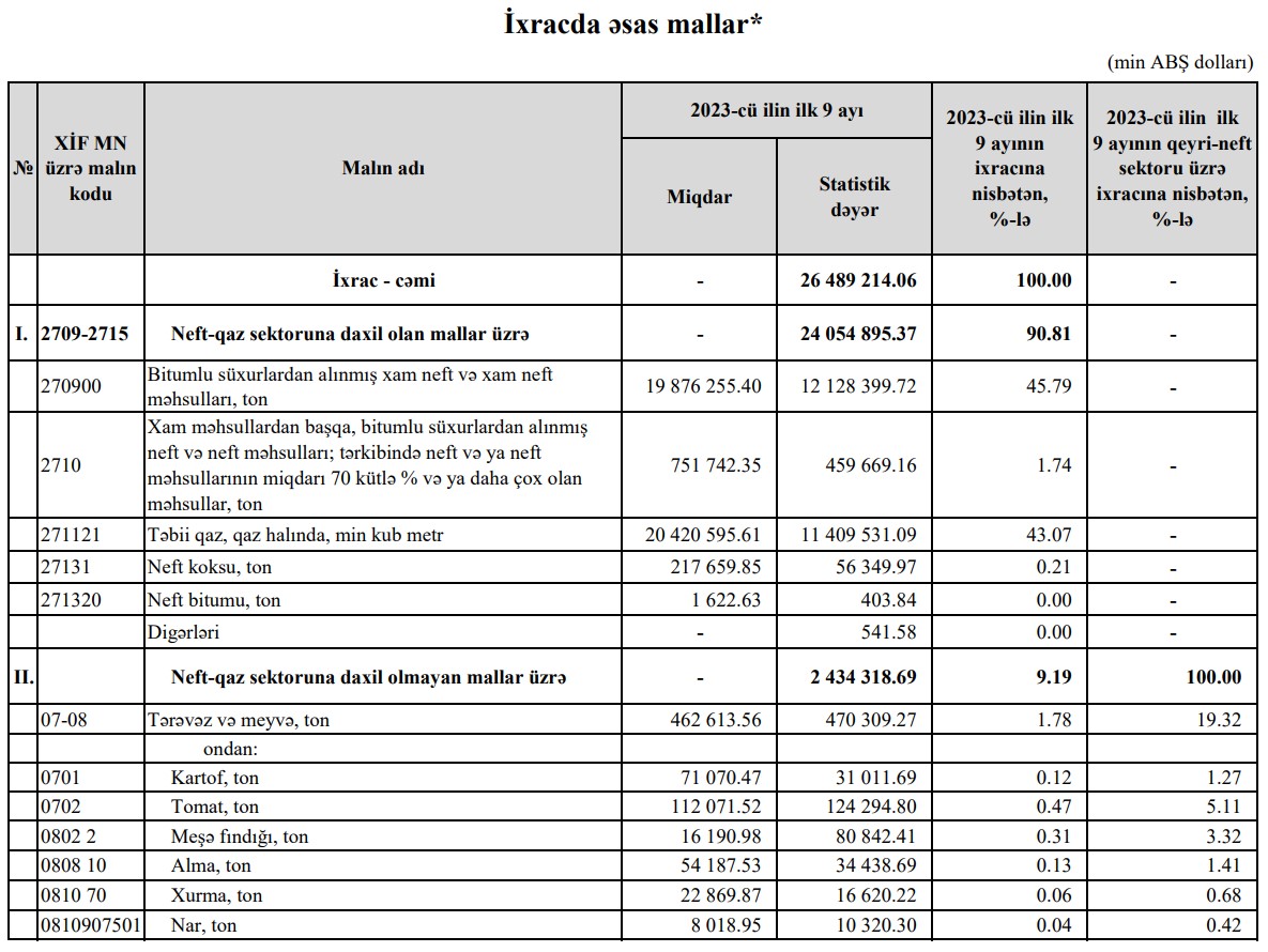 Neft-qaz sektoruna daxil olan mallar 2023-cü ilin 9 ayının ixracının 90.81%-ni formalaşdırıb.