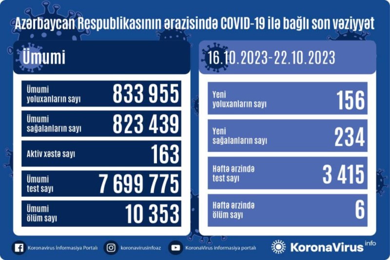 Azərbaycanda koronavirus (COVID-19) infeksiyasına son 1 həftədə (16.10.2023-22.10.2023) 156 yeni yoluxma faktı qeydə alınıb, 234 nəfər müalicə olunaraq sağalıb.