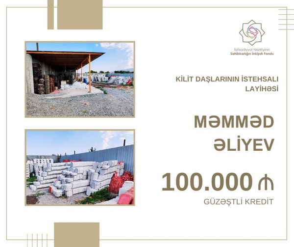 Naxçıvanda fəaliyyət göstərən sahibkar Məmməd Əliyev kilit daşlarının istehsalı layihəsi üzrə Sahibkarlığın İnkişafı Fondundan 100 min manat güzəştli kredit əldə edib.