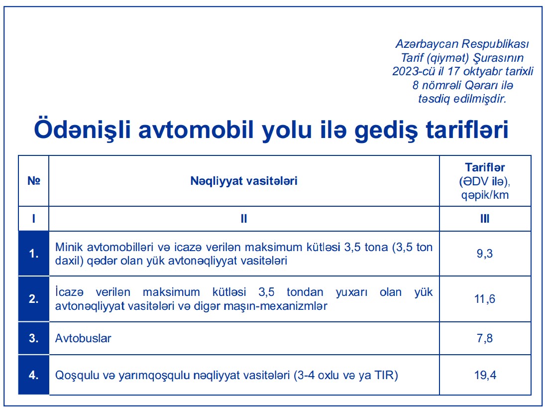 Avtonəqliyyat vasitələrinin növünə və müxtəlif məntəqələrə uyğun ödənişli yoldan istifadəyə görə QİYMƏT CƏDVƏLİ: