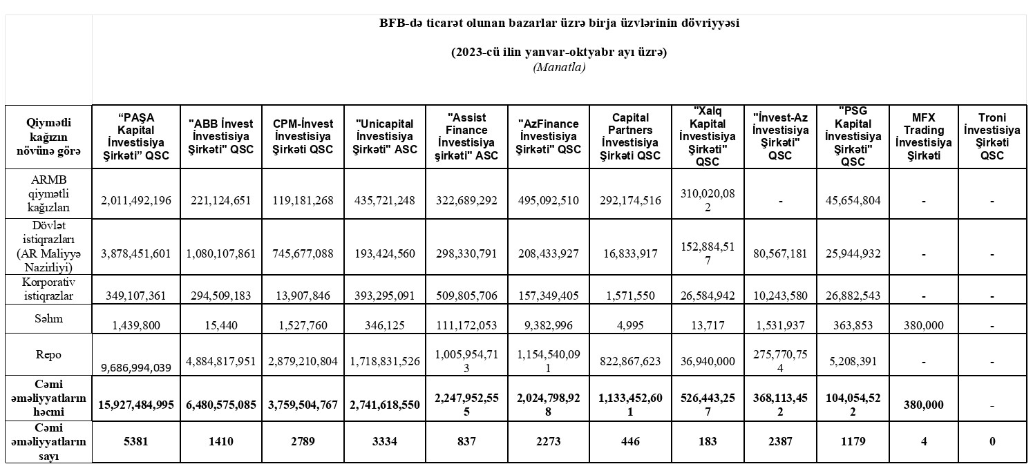 2023-cü ilin yanvar-oktyabr ayı üzrə Bakı Fond Birjasında (BFB) ticarət olunan bazarlar üzrə birja üzvlərinin dövriyyələri açıqlanıb.