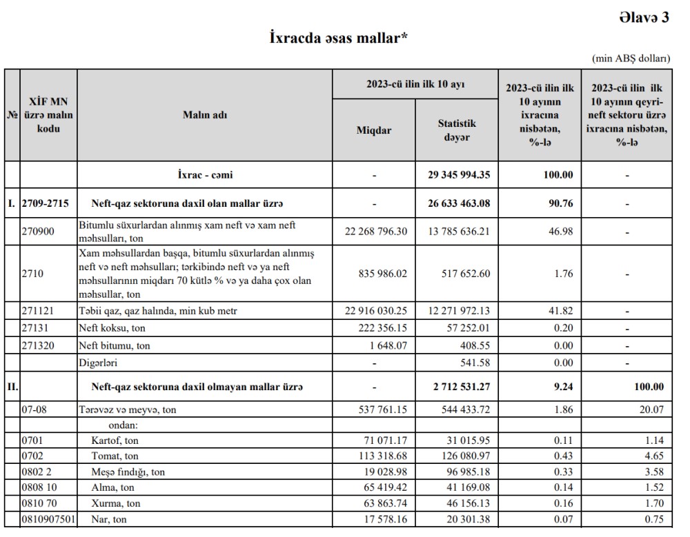 2023-cü ilin ilk 10 ayı ərzində (yanvar-oktyabr) Azərbaycanın 29 milyard 345 milyon 994 min dollarlıq cəmi ixracının 26 milyard 633 milyon 463 min dolları və ya 90,76%-i neft-qaz sektoruna daxil olan mallar üzrə olub.