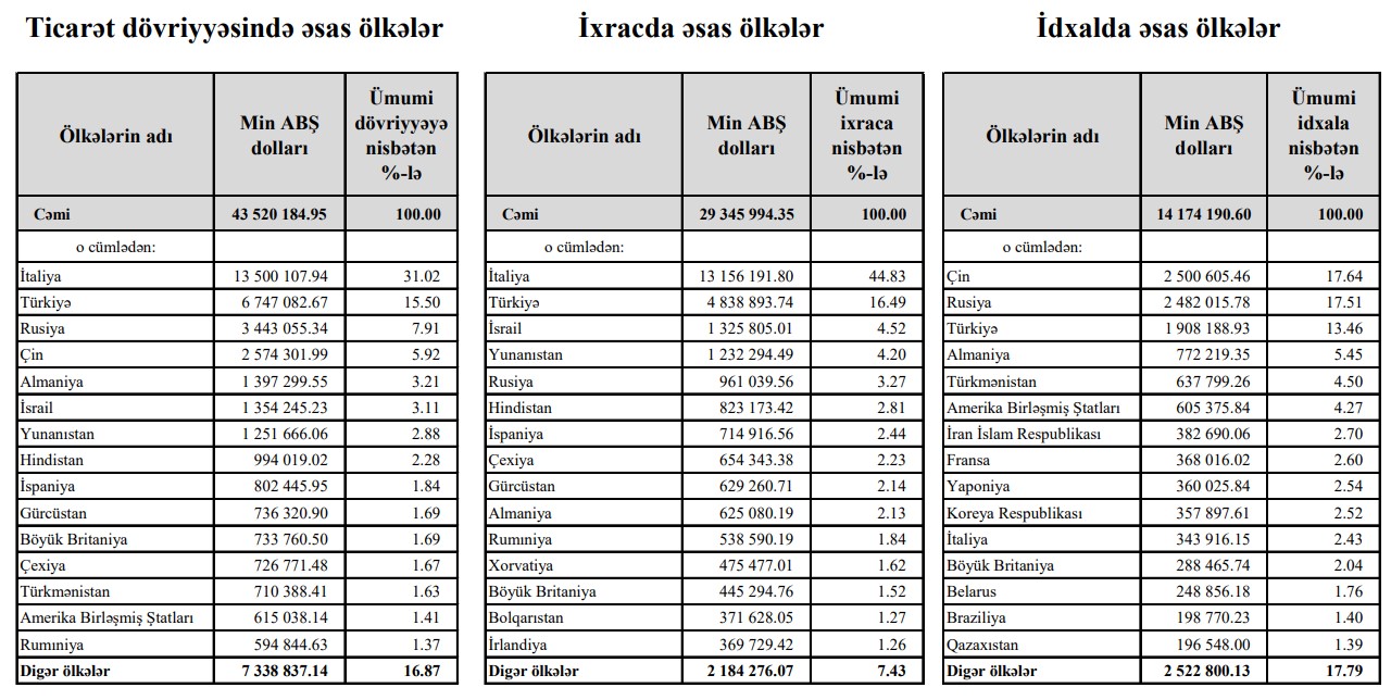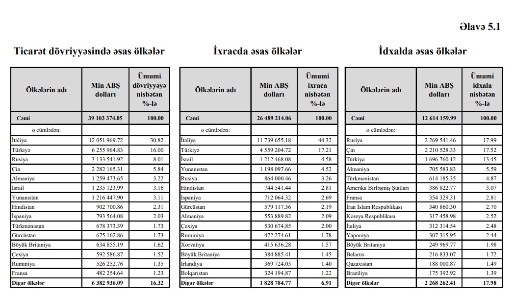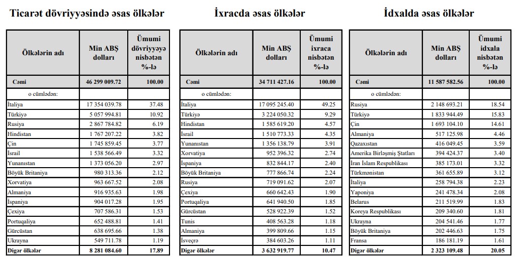 2023-cü ilin 9 ayında (yanva-sentyabr) Azərbaycanın Rusiyadan idxalı 2 milyard 269 milyon 541 min dollar, Çindən idxalı isə 2 milyard 210 milyon 528 min dollar olmuşdu.