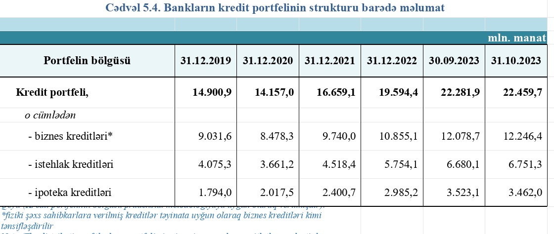 Oktyabrın sonunda 12 milyard 246 milyon 386 min manatlıq biznes kreditlərinin 426,7 milyon manatını və ya 3,5%-ni qeyri-işlək kreditlər təşkil edib.