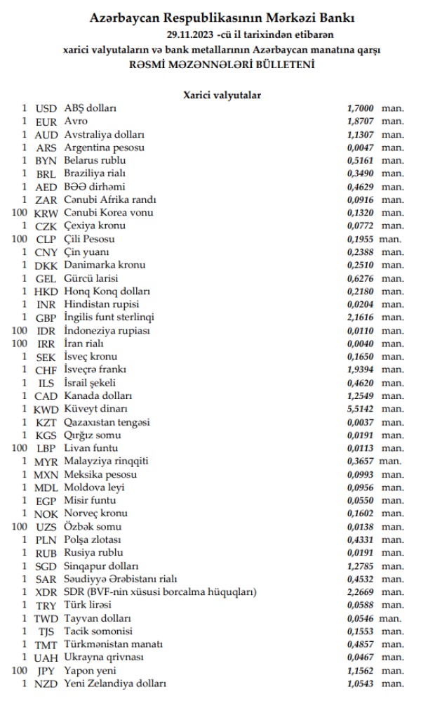 Dolların bazar ertəsi üçün rəsmi məzənnəsi müəyyən olunub