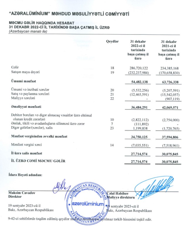 Ötən il “Azəralüminium” folqa və digər alüminium məhsullarının satışından 167 milyon 498 min manat (2021-də 179 milyon 601 min manat), ilkin alüminiumun satışından 112 milyon 157 min manat (2021-də 49 milyon 4221 min manat), digər satışlardan 7 milyon 64 min manat (2021-də 5 milyon 363 min manat) gəlir əldə edib. Ötən il “Azəralüminium”un ilkin alüminiumun satışından gəliri 2,3 dəfə artıb.