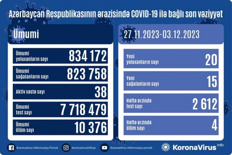 Azərbaycanda koronavirus (COVID-19) infeksiyasına son 1 həftədə (27.11.2023-03.12.2023) 20 yeni yoluxma faktı qeydə alınıb, 15 nəfər müalicə olunaraq sağalıb.