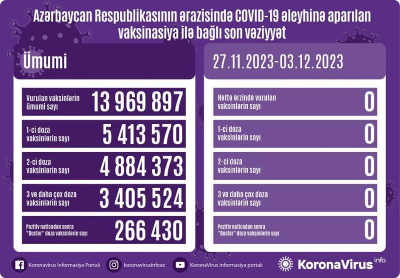 Ölkədə vurulan vaksinlərin ümumi sayı 13 969 897, birinci mərhələ üzrə vaksinasiya olunanların ümumi sayı 5 413 570, ikinci mərhələ üzrə vaksinasiya olunanların sayı 4 884 373, üç və daha çox doza vaksin vurduranların sayı 3 405 524, pozitiv nəticədən sonra buster doza üzrə vaksinasiya olunanların sayı isə 266 430 təşkil edir.