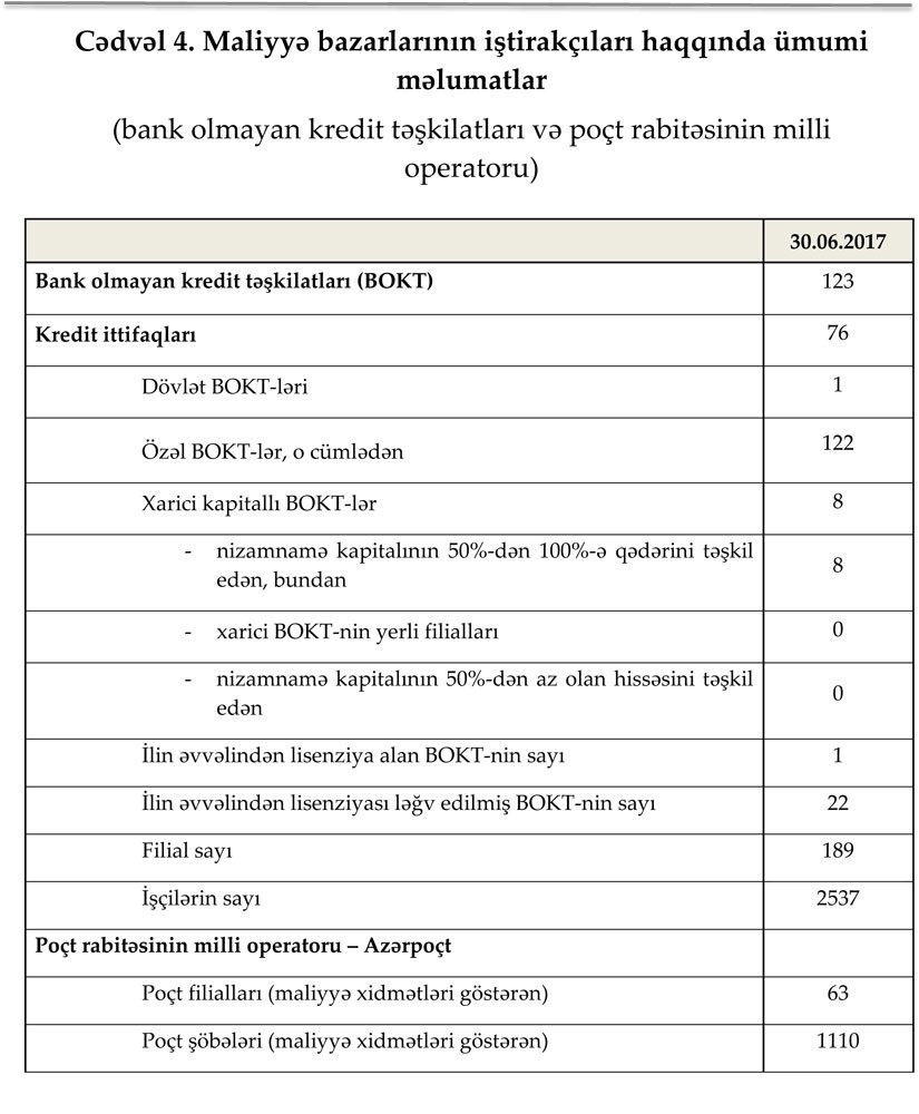 Azərbaycanda fəaliyyət göstərən 31 bankın 30 iyun 2017-ci il tarixinə cəmi aktivləri 30 milyard 36.9 milyon manat, cəmi öhdəlikləri 27 milyard 322.9 milyon manat təşkil etmişdir.