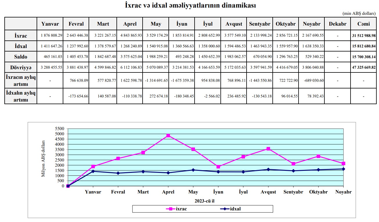 2023-cü ilin yanvar-noyabr dövründə (11 ayda) Azərbaycanın xarici ticarət dövriyyəsi 47 milyard 325 milyon 670 min dollar, o cümlədən ixrac 31 milyard 512 milyon 988 min dollar, idxal 15 milyard 812 milyon 681 min dollar, saldo 15 milyard 700 milyon 308 min dollar təşkil edib.
