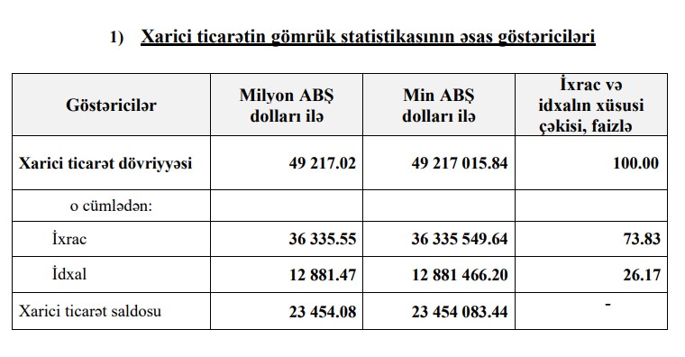 2022-ci ilin 11 ayında (yanvar-noyabr) Azərbaycanın xarici ticarət dövriyyəsi 49 milyard 217 milyon 16 min dollar, o cümlədən ixrac 36 milyard 335 milyon 550 min dollar, idxal 12 milyard 881 milyon 466 min dollar, xarici ticarət saldosu 23 milyard 454 milyon 83 min dollar təşkil etmişdi.