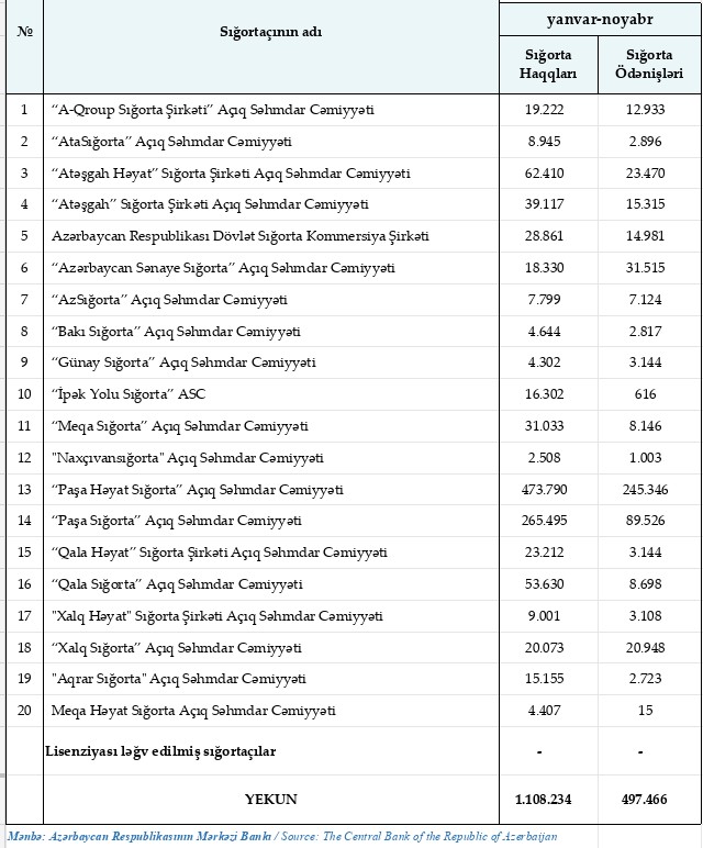 2023-cü ilin yanvar-noyabr ayları ərzində (11 ayda) Azərbaycanın sığorta şirkətləri tərəfindən 1 milyard 108 milyon 234 min manat sığorta haqları hesablanıb, 497 milyon 466 min manat sığorta ödənişləri həyata keçirilib.