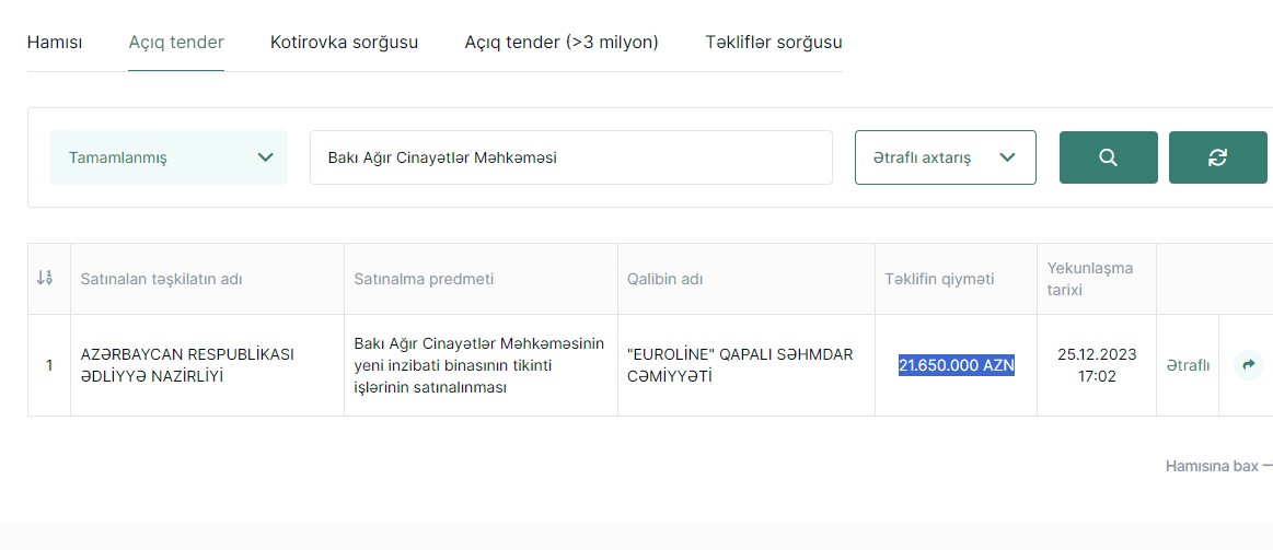 Marja.az-ın məlumatına görə, tenderin qalibi "Euroline" QSC şirkətidir. Bu şirkətin təklifinin qiyməti 21 milyon 650 min manatdır.
