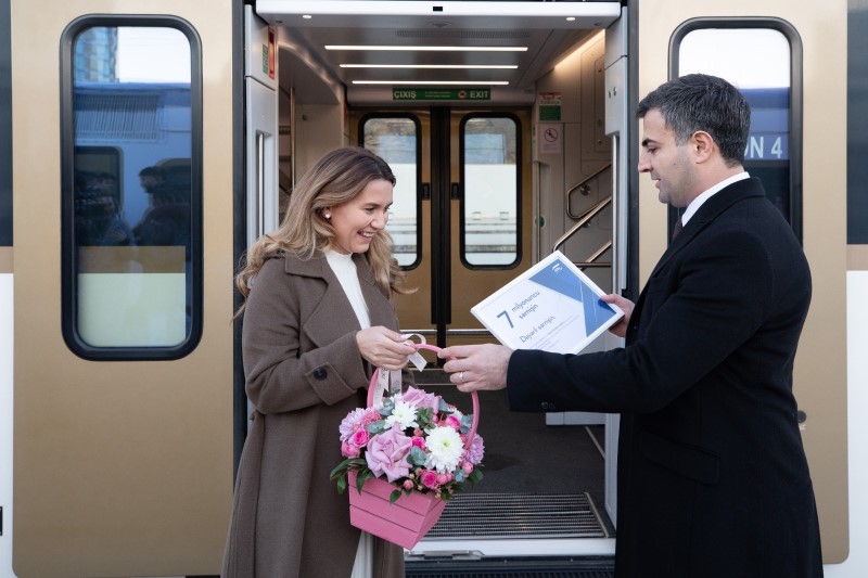 ADY-nin Sərnişin daşımaları departamentinin nümayəndələri 7 milyonuncu sərnişin Sevil Əlimərdanovanı təbrik edərək bu münasibətlə ona ölkədaxili istiqamətlər üçün birinci sinif üzrə iki gediş-dönüş bileti və xatirə hədiyyələri təqdim edib.