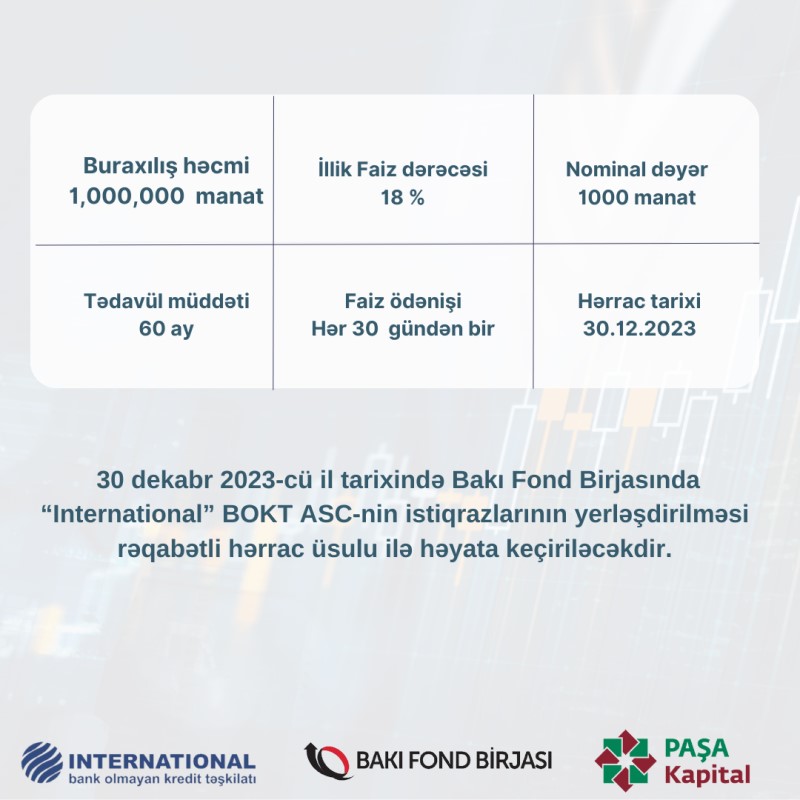 Birjanın yaydığı məlumata görə, 30 dekabr 2023-cü il tarixində Bakı Fond Birjasında BOKT "İnternational" ASC-nin istiqrazlarının yerləşdirilməsi rəqabətli hərrac üsulu ilə həyata keçiriləcək.