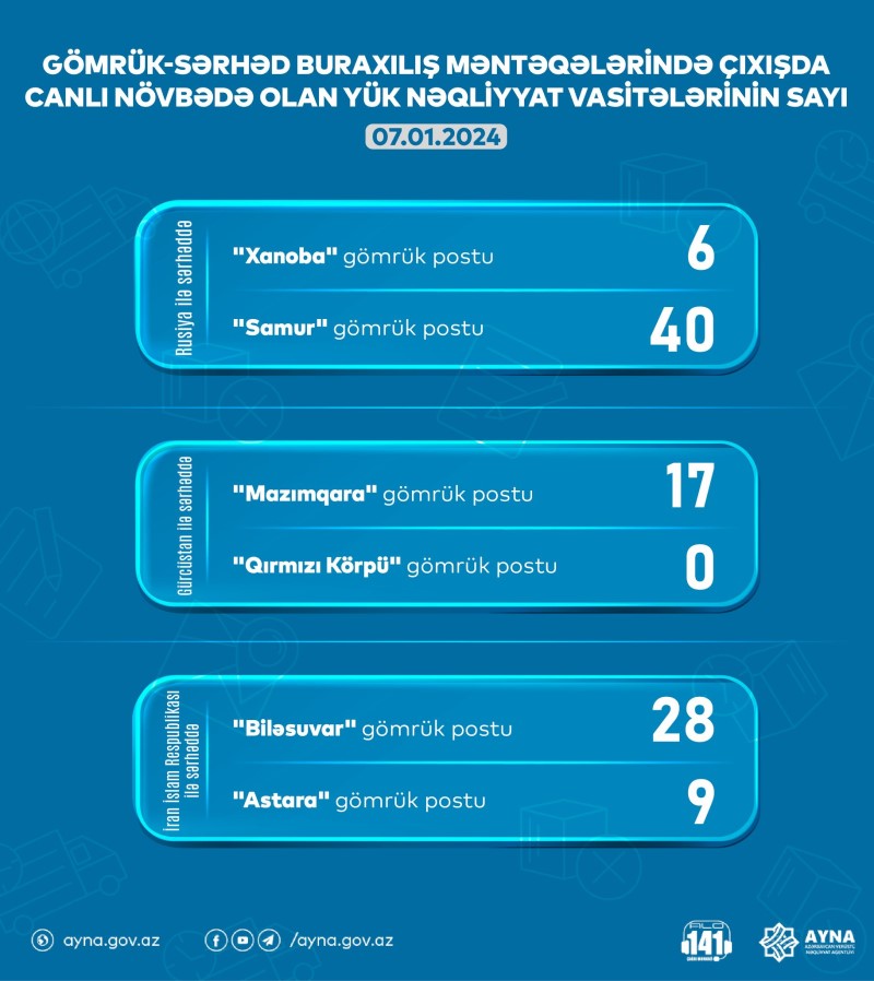 Gömrük-sərhəd məntəqələrində çıxışda gözləmədə olan nəqliyyat vasitələrinin sayı barədə məlumata əsasən, “Astara” gömrük postunda 9, “Biləsuvar” gömrük postunda 28, “Qırmızı Körpü” gömrük postunda 0, “Mazımqara” gömrük postunda 17, “Samur” gömrük postunda 40 və “Xanoba” gömrük postunda 6 yük maşını var.
