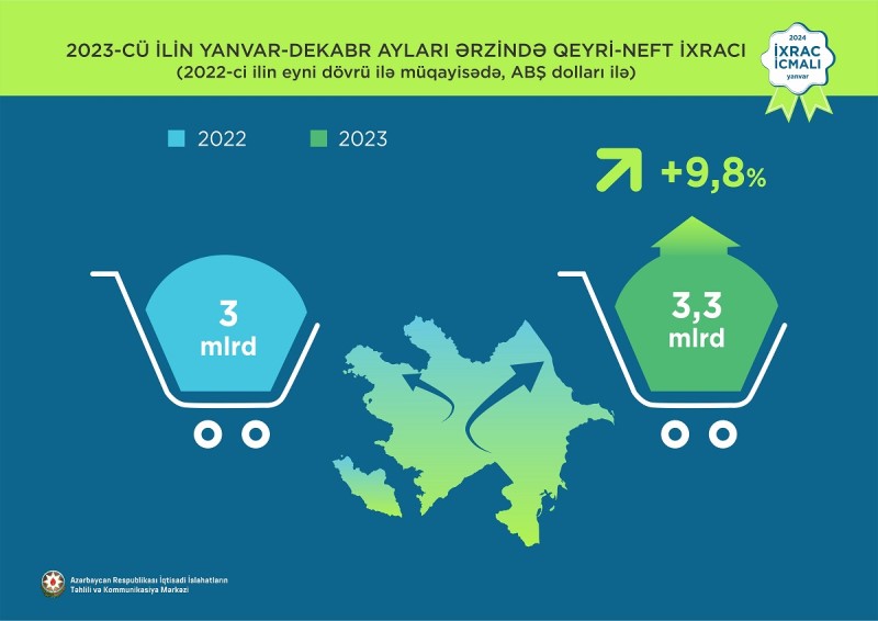 İqtisadi İslahatların Təhlili və Kommunikasiya Mərkəzinin hazırladığı “İxrac icmalı”nın yanvar sayına əsasən, 2023-cü ilin yanvar-dekabr ayları ərzində Azərbaycanın ümumi ixracı 33,9 milyard ABŞ dolları, qeyri-neft sektoru üzrə ixrac isə 2022-ci ilin müvafiq dövrü ilə müqayisədə 9,8% artaraq 3,3 milyard ABŞ dolları (ümumi ixracın 9,7%) təşkil edib.