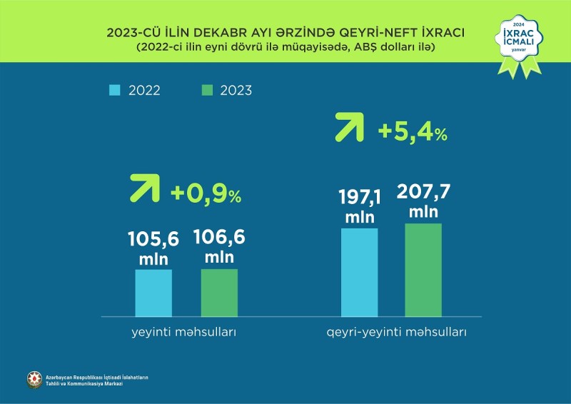 Ötən ilin dekabr ayının qeyri-neft ixracı 3,8% artaraq 314,3 milyon ABŞ dolları olub. Yeyinti məhsulları üzrə ixrac isə 0,9% artımla 106,6 milyon ABŞ dolları, qeyri-yeyinti məhsulları üzrə ixrac isə 5,4% artımla 207,7 milyon ABŞ dolları təşkil edib.